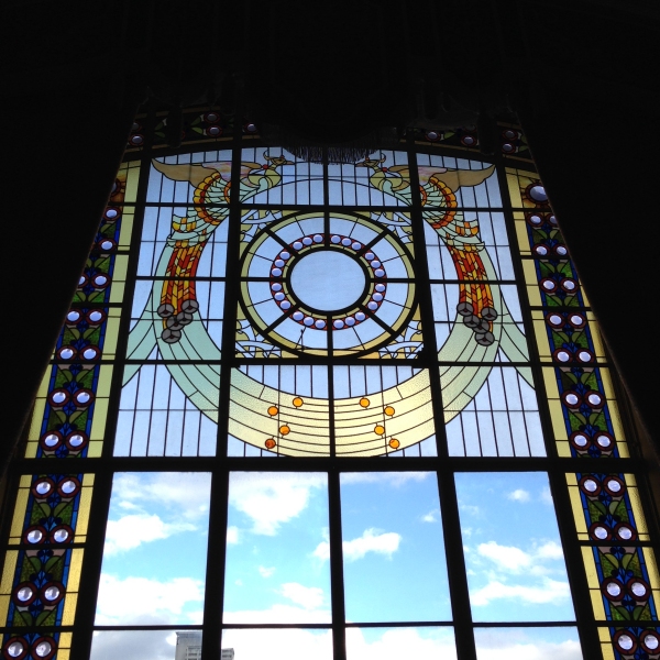 天井の照明が吊り下がってるところが明かり取りの窓でステンドグラスになっていた。