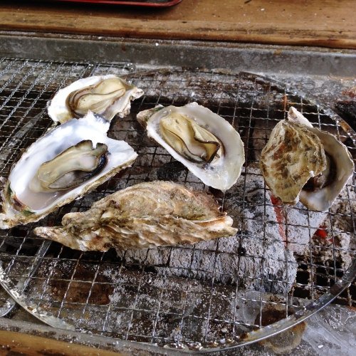 目の前で炭火で焼く牡蠣、一気に網に乗っけたら意外とすぐに蓋がぱかっとなって、殻を開けるのにあわてふためきました。楽しい。…が、自分で焼くとどのくらい火を通せばいいのか加減が分からなくて、全体的に焼きすぎてしまった感。