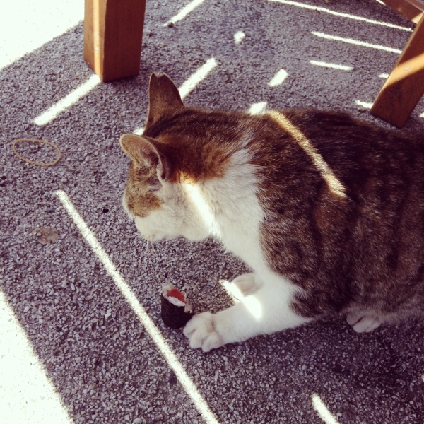 父がちょっといいマグロのお寿司を買って外で開けたら鉄火巻きがころりと落ちて、ひゃーと悲鳴を上げるのでぱっとテーブルの下を見たら、あっちゅう間に猫が来て取っていったという。