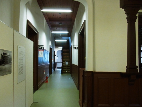 階段のあるホールから廊下を見たところ。こちらは実際に使用されている部分だからか、床といい壁といい廊下の照明といい、実用的なものになっています。